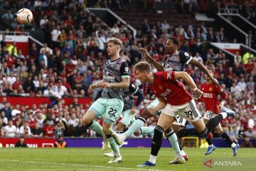 Pesepak bola Manchester United Scott McTominay mencetak gol keduanya ke gawang Brentford dalam laga lanjutan Liga Inggris di Old Trafford, Manchester, Inggris, Sabtu (7/10/2023). Mctominay mencetak gol di menit 93 dan 97 untuk memenangkan timnya dari ketinggalan 0-1 sejak menit 26. ANTARA FOTO/Action Images via Reuters/Jason Cairnduff/foc.