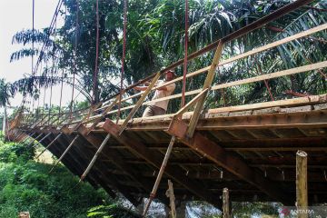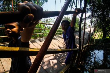 Tiga anak bergantungan di besi saat melewati jembatan gantung yang terputus di Desa Alue Keujruen, Kecamatan Tanah Luas, Aceh Utara, Aceh. Selasa (10/10/2023). Putus dan ambruknya jembatan gantung penghubung enam kecamatan tersebut dikarenakan kondisi rekontruksi tua sehingga tidak mampu menahan beban berat kenderaan roda empat yang kerap melewati jembatan tersebut. ANTARA FOTO/Rahmad/hp.