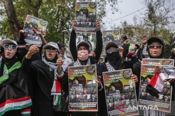 Pengunjuk rasa saat mengikuti aksi solidaritas untuk Palestina di depan Kedutaan Besar Amerika Serikat, Jakarta, Rabu (11/10/2023). Mereka menentang sikap AS yang pro Israel dalam koflik dengan Palestina, serta menuntut hak kemerdekaan negara Palestina. ANTARA FOTO/Fauzan/Spt.