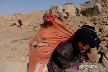 Seorang pria Afghanistan membawa karung pasca gempa bumi di Desa Chahak, Distrik Enjil, Herat, Afghanistan, Rabu (11/10/2023). Gempa berkekuatan magnitudo 6,3 yang mengguncang Afghanistan pada Sabtu (7/10) itu mengakibatkan sedikitnya 2500 orang tewas, dan ribuan lainnya terluka. ANTARA FOTO/REUTERS/Ali Khara/Spt.