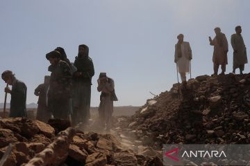 Pria Afghanistan berdiri di puing-puing rumah yang hancur pasca gempa bumi di distrik Zinda Jan, Herat, Afghanistan, Rabu (11/10/2023). Gempa berkekuatan magnitudo 6,3 yang mengguncang Afghanistan pada Sabtu (7/10) itu mengakibatkan sedikitnya 2500 orang tewas, dan ribuan lainnya terluka. ANTARA FOTO/REUTERS/Ali Khara/Spt.