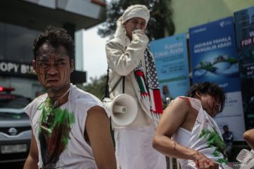 Sejumlah seniman melakukan aksi teatrikal tentang kekerasan pada konflik Israel-Palestina di Dompet Dhuafa Philanthropy Building, Jakarta, Kamis (12/10/2023). Dalam kegiatan tersebut, Dompet Dhuafa mendorong kesatuan masyarakat Indonesia untuk terus berupaya menggulirkan program-program kemanusiaan bagi rakyat Palestina. ANTARA FOTO/Fauzan/hp.