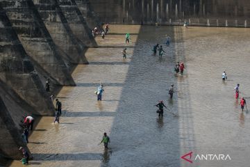 Warga mencari ikan memanfaatkan ditutupnya saluran irigasi Bendungan Colo di Nguter, Sukoharjo, Jawa Tengah, Senin (16/10/2022). Bendungan Colo yang mengairi lahan pertanian seluas sekitar 25 ribu hektare di Kabupaten Wonogiri, Sukoharjo, Klaten, Karanganyar, Sragen hingga Ngawi itu ditutup sementara selama satu bulan untuk dilakukan pemeliharaan dan menyusutnya saluran air irigasi tersebut dimanfaatkan warga untuk mencari ikan. ANTARA FOTO/Mohammad Ayudha/aww.