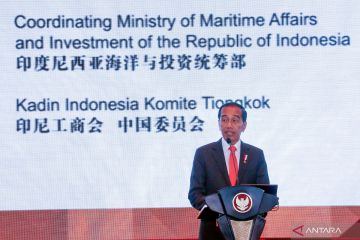 Presiden Joko Widodo menyampaikan sambutan saat menghadiri Forum Bisnis Indonesia-China di Beijing, China, Senin (16/10/2023). Presiden Jokowi mengajak para pengusaha China untuk datang dan berinvestasi ke Indonesia dalam kerangka kerja sama yang saling menguntungkan. ANTARA FOTO/Desca Lidya Natalia/hp.