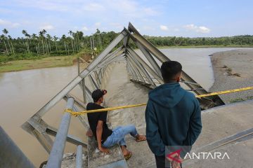 Warga melihat konstruksi jembatan rangka baja penghubung Desa Alue Buloh dan Desa Krueng Mangkom yang ambruk di Kecamatan Seunagan, Nagan Raya, Aceh, Rabu (18/10/2023). Jembatan rangka baja dengan panjang 150 meter tersebut ambruk pada Selasa (17/10/2023) akibat beton penahan jembatan terkikis air dan menyebabkan terganggunya aktivitas perekonomian masyarakat sekitar yang mengharuskan warga menggunakan jalur alternatif lain dengan jarak tempuh sekitar 40 kilometer. ANTARA FOTO/Syifa Yulinnas/rwa.