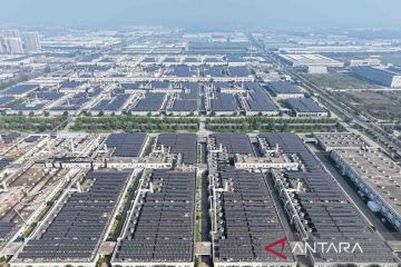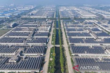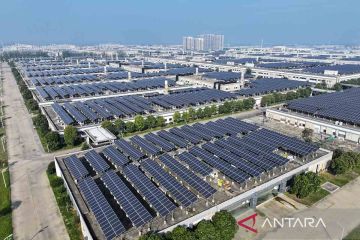 Foto udara pembangkit listrik tenaga fotovoltaik (surya) di atap sebuah perusahaan di Suchu Industrial Park, Suqian, Provinsi Jiangsu, China, Rabu (18/10/2023). ANTARA FOTO/CFOTO/Sipa USA via Reuters Conne/Costfoto/rwa.
