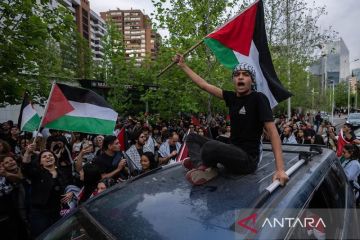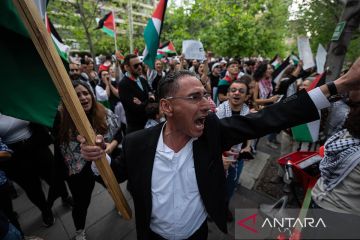 Pengunjuk rasa membawa bendera dan poster ketika melakukan protes di depan Kedutaan Besar Israel di Santiago, Chili, Amerika Latin, Kamis (19/10/2023). Menurut Kementerian Kesehatan Palestina jumlah korban warga Palestina akibat serangan Israel, telah mencapai 3.859 tewas dan 13.300 lainnya luka-luka, hingga kini serangan belum berhenti. ANTARA FOTO/REUTERS/Carlos P. Carcamo/Spt.