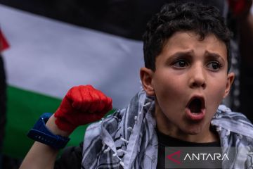 Seoranga anak laki-laki mengikuti aksi unjuk rasa di depan Kedutaan Besar Israel di Santiago, Chili, Amerika Latin, Kamis (19/10/2023). Menurut Kementerian Kesehatan Palestina jumlah korban warga Palestina akibat serangan Israel, telah mencapai 3.859 tewas dan 13.300 lainnya luka-luka, hingga kini serangan belum berhenti. ANTARA FOTO/REUTERS/Carlos P. Carcamo/Spt.