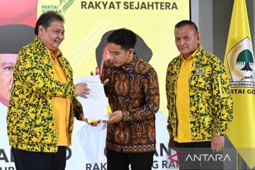 Ketua Umum Partai Golkar Airlangga Hartarto (kiri) didampingi Sekjen Lodewijk Freidrich Paulus (kanan) menyerahkan surat keputusan Rapimnas ke-2 Partai Golkar kepada Wali Kota Solo Gibran Rakabuming Raka di Kantor DPP Partai Golkar, Jakarta, Sabtu (21/10/23). Rapimnas Partai Golkar mengusung dan mendukung Gibran Rakabuming Raka sebagai bakal calon wakil presiden untuk berpasangan dengan Prabowo Subianto pada Pemilu 2024. ANTARA FOTO/Sigid Kurniawan/rwa.
