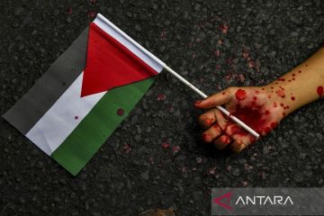 Seorang peserta Aksi Solidaritas untuk Palestina melakukan aksi teatrikal saat berunjuk rasa di Jakarta, Jumat (20/10/2023). Dalam aksi tersebut mereka meminta para pemimpinan negara Arab serta dunia untuk bersatu dan mendesak Israel segera menghentikan kekejaman terhadap warga Palestina. ANTARA FOTO/Muhammad Adimaja/tom.