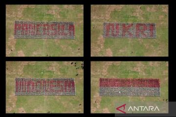 Foto kombo sejumlah santri mengangkat kertas berwarna merah putih membentuk formasi tulisan saat mengikuti Apel Merah Putih di Stadion Hoegeng, Kota Pekalongan, Jawa Tengah, Sabu (21/10/2023). Apel Merah Putih itu dilaksanakan dalam rangka memperingati Maulid Nabi Muhammad SAW yang digelar oleh Kanzus Sholawat yang diikuti ratusan peserta gabungan TNI, Polri, ormas, santri, dan pelajar dengan ikrar NKRI serta sebanyak 1.300 pelajar SMK Syafi'i Akrom membentuk konfigurasi barisan tulisan. ANTARA FOTO/Harviyan Perdana Putra/tom.