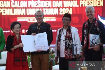 Ketua KPU Hasyim Asy'ari (kedua kiri) menerima berkas syarat pencalonan menjadi presiden dan wakil presiden dari Ketua Umum PDI Perjuangan Megawati Soekarnoputri (kiri) disaksikan bakal pasangan calon presiden dan wakil presiden Ganjar Pranowo (kanan) dan Mahfud MD (kedua kanan) di Kantor KPU, Jakarta, Kamis (19/10/2023). ANTARA FOTO/Akbar Nugroho Gumay/tom.