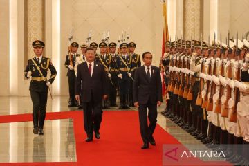 Presiden Joko Widodo (kanan) bersama Presiden China Xi Jinping saat upacara penyambutan kenegaraan di Great Hall of the People, Beijing, China, Selasa (17/10/2023). Dalam upacara tersebut Presiden Jokowi dan Presiden Xi Jinping melakukan inspeksi pasukan dan memperkenalkan delegasi dari negara masing-masing. ANTARA FOTO/Desca Lidya Natalia/tom.