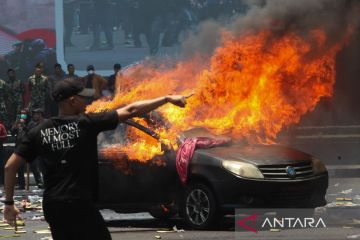 Massa membakar mobil saat aksi anarkis dalam simulasi Sistem Pengamanan Kota (Sispamkota) di Kodam V/Brawijaya, Surabaya, Jawa Timur, Selasa (17/10/2023). Simulasi tersebut digelar untuk menunjukkan kesiapsiagaan TNI-Polri dalam melakukan pengamanan Pemilu 2024. ANTARA FOTO/Didik Suhartono/tom.