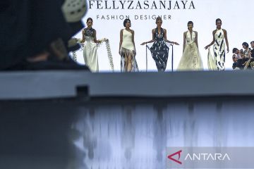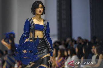 Model memperagakan busana rancangan desainer Fellyza Sanjaya dengan judul A Dialogue of Art pada final Lomba Perancang Mode 2023 dalam Jakarta Fashion Week (JFW) 2024 di Pondok Indah Mall 3, Jakarta, Selasa (24/10/2023). Lomba tersebut menampilkan 10 finalis perancang mode muda dengan tema "Authenticity". ANTARA FOTO/Muhammad Adimaja/rwa.