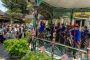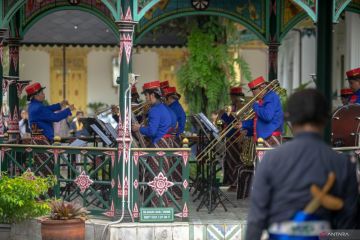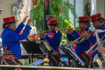Abdi Dalem Musikan yang tergabung dalam Yogyakarta Royal Orchestra memainkan musik di Bangsal Mandalasana Keraton Yogyakarta, Sabtu (28/10/2023). Pentas Musikan Mandalasana dari tim ensembel tiup Yogyakarta Royal Orchestra tampil membawakan lagu Indonesia Raya, Satu Nusa Satu Bangsa, Bhinneka Tunggal Ika, Bangun Pemudi Pemuda, Garuda Pancasila, hingga Bagimu Negeri untuk memperingati Hari Sumpah Pemuda. ANTARA FOTO/Andreas Fitri Atmoko/foc.