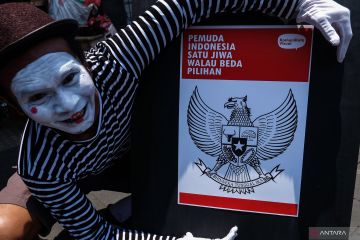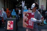 Seniman asal Aceh Rasyidin Wig Maroe menampilkan pertunjukan pantomim di hadapan pengunjung Pasar Gede Solo, Jawa Tengah, Sabtu (28/10/2023). Aksi memperingati Hari Sumpah Pemuda tersebut digelar untuk mengajak masyarakat menjaga persatuan dan menghargai perbedaan menjelang tahun politik pada 2024 mendatang. ANTARAFOTO/Maulana Surya/foc.