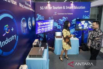 Pengunjung melihat produk teknologi informasi pada acara Industry Summit 5G di Solo Technopark, Solo, Jawa Tengah, Selasa (31/10/2023). Acara yang diselenggarakan Masyarakat Telematika Indonesia (Mastel) tersebut untuk mendukung program Pemerintah Indonesia terkait dengan percapatan ekosistem 5G guna mencapai visi Indonesia digital tahun 2030 dan 2045. ANTARA FOTO/Mohammad Ayudha/Spt.