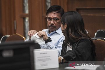 Terdakwa kasus dugaan korupsi penyediaan infrastruktur BTS 4G dan infrastruktur pendukung paket 1, 2, 3, 4 dan 5 dari BAKTI Kemenkominfo tahun 2020 - 2022 Johnny G Plate berbincang dengan kuasa hukumnya usai membacakan nota pembelaan (pleidoi) di Pengadilan Tipikor, Jakarta, Rabu (1/11/2023). Dalam pembelaannya mantan menkominfo tersebut menyampaikan permohonan maaf kepada Presiden Joko Widodo dan masyarakat di wilayah 3T karena pembangunan menara BTS 4G tidak dapat diselesaikan tepat waktu, dan meminta keringanan hukuman dari tuntutan JPU. ANTARA FOTO/Muhammad Adimaja/Spt.
