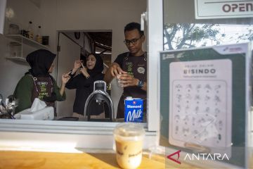 Penyandang disabilitas tunarungu dan tunawicara meracik kopi di kedai kopi Teman Istimewa di Indramayu, Jawa Barat, Rabu (1/11/2023). Kedai kopi Teman Istimewa binaan PT Kilang Pertamina Internasional (KPI) Balongan tersebut sebagai ruang inkulsi bagi para disabilitas untuk mengembangkan kepercayaan diri dan keahlian dalam berwirausaha. ANTARA FOTO/Dedhez Anggara/Spt.