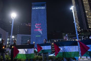 Aktivis Greenpeace Indonesia menggelar aksi damai solidaritas untuk warga Palestina di Jakarta, Jumat (3/11/2023). Mereka mengutuk keras serangan terhadap warga sipil Palestina di Gaza oleh otoritas Israel dan mendesak Israel dan Hamas untuk segera melakukan gencatan senjata. ANTARA FOTO/Sigid Kurniawan/foc.
