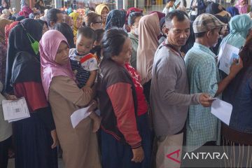 Warga penerima manfaat antre bantuan pangan cadangan pemerintah dalam penyaluran tahap kedua di Kantor Pos Batam Centre, Batam, Kepulauan Riau, Senin (6/11/2023). Bantuan beras tersebut diberikan kepada 32.533 keluarga penerima manfaat (KPM) guna menekan kenaikan harga beras di pasaran sekaligus mengendalikan inflasi di daerah itu. ANTARA FOTO/Teguh Prihatna/Spt.