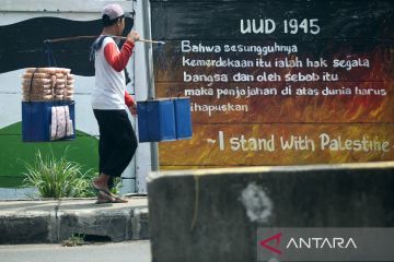 Seorang pedagang melintas di depan mural bertema dukungan kepada Palestina di Jalan Raya Juanda, Kota Depok, Jawa Barat, Senin (6/11/2023). Mural tersebut merupakan bentuk solidaritas warga terhadap rakyat Palestina yang sedang dilanda konflik dengan Israel. ANTARA FOTO/Yulius Satria Wijaya/Spt.