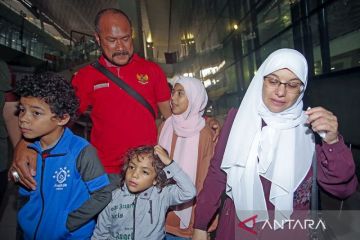 Warga Negara Indonesia (WNI) yang bekerja sebagai aktivis kemanusiaan di Palestina Abdilah Onim (kedua kiri) beserta keluarga tiba di Bandara Soekarno Hatta, Tangerang, Banten, Senin (6/11/2023). Kementerian Luar Negeri berhasil mengevakuasi satu keluarga WNI yang tinggal di Gaza, Palestina dan masih ada 7 orang WNI yang belum berhasil dievakuasi karena terkendala situasi mencekam di Gaza. ANTARA FOTO/Muhammad Iqbal/wpa.
