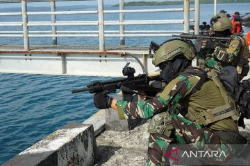 Anggota Kopaska TNI AL bersiaga saat simluasi pengamanan VVIP di Dermaga Pelabuhan Arar, Kabupaten Sorong, Papua Barat Daya, Kamis (9/11/2023). Komando Armada III melaksanakan latihan simulasi pengamanan VVIP untuk memberikan pemahaman tugas dan tanggung jawab masing-masing unsur maupun kesiapan teknis alutsista yang terlibat dalam Satgas Laut pengamanan VVIP baik perorangan maupun satuan. ANTARA FOTO/Olha Mulalinda/Spt.