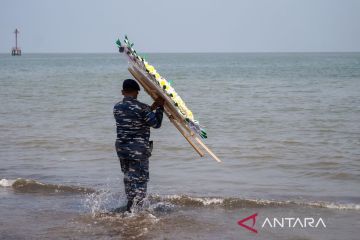 Anggota TNI AL membawa karangan bunga yang akan ditebar di laut Pantai Utara Kabupaten Batang, Jawa Tengah, Jumat (10/11/2023). Memperingati Hari Pahlawan 2023, pemerintah setempat beserta TNI dan Polri melaksanakan tabur bunga di laut Pantai Utara dan doa bersama di makam pahlawan untuk mengenang jasa para pahlawan yang telah gugur. ANTARA FOTO/Harviyan Perdana Putra/tom.