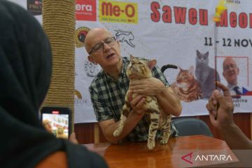 Juri Internasional asal Republik Ceko Martin Kabina memberikan penilaian terhadap salah satu kucing peserta dalam International Cat Show di Banda Aceh, Aceh, Sabtu (11/11/2023). International Cat Show yang berlangsung hingga 12 November 2023 itu diikuti sekitar seratusan kucing berbagai ras sekaligus ajang sosialisasi undang-undang kekerasan terhadap hewan kepada peserta. ANTARA FOTO/Ampelsa/nz.ANTARA FOTO/AMPELSA (ANTARA FOTO/AMPELSA)