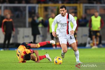 Pemain Lecce Nicola Sansone (kiri) berebut bola dengan pemain AC Milan Alessandro Florenzi dalam pertandingan sepak bola Liga Italia di Stadio Via del mare, Lecce, Italia, Sabtu (11/11/2023). Pertandingan berakhir imbang dengan skor 2-2. ANTARA FOTO/Reuters/Daniele Mascolo/nym.