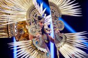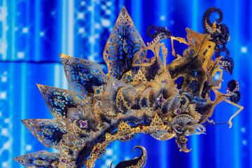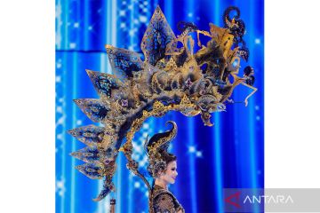 Desain serupa wayang kulit saat dikenakan di atas kepala Miss Mongolia Namuunzul Batmagnai di sesi National Costume Show ajang Miss Universe ke-72 di San Salvador, El Salvador, Kamis (16/11/2023). ANTARA FOTO/REUTERS/Jose Cabezas/foc.