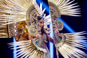 Miss Guyana Lisa Andrea Narine tampil di sesi National Costume Show ajang Miss Universe ke-72 di San Salvador, El Salvador, Kamis (16/11/2023). ANTARA FOTO/REUTERS/Jose Cabezas/foc.