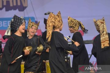 Anak-anak dari sanggar Sandiko Bukittinggi, memainkan tarian mengadaptasi permainan tradisional Sapu-sapu Rangik, saat Festival Anak di halaman Istana Gubernur Sumatera Barat di Padang, Sabtu (18/11/2023). Festival Anak bertajuk Pertemuan di Taman Bermain menghadirkan ruang temu yang inklusif untuk anak sekaligus dalam rangka menyambut Hari Anak Sedunia pada 20 November. .ANTARA FOTO/Iggoy el Fitra/YU