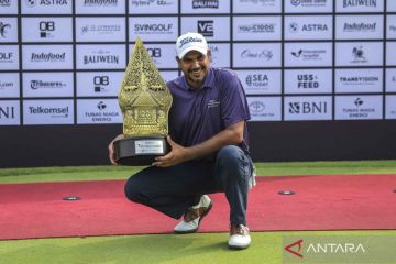 Pegolf India Gaganjeet Bhullar melakukan selebrasi usai memasukkan bola di lubang 18 saat putaran final BNI Indonesian Masters 2023 di Royale Jakarta Golf Club, Jakarta, Minggu (19/11/2023). Gaganjeet Bhullar berhasil menjadi juara pertama dengan hadiah uang sebesar 270.000 dolar AS, diikuti juara kedua pegolf India Karandeep Kochhar, juara tiga pegolf Australia Ben Campbell, pegolf Spanyol David Puig serta pegolf Korea Selatan Kyojung Moon. ANTARA FOTO/Galih Pradipta/nym.