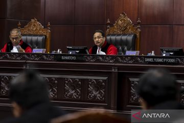 Hakim Konstitusi Suhartoyo memimpin jalannya sidang uji materiil Undang-Undang Nomor 7 Tahun 2017 tentang Pemilihan Umum di Mahkamah Konstitusi (MK), Jakarta, Senin (20/11/2023). Sidang tersebut beragendakan mendengarkan keterangan Presiden dan DPR. ANTARA FOTO/Bayu Pratama S/aww.