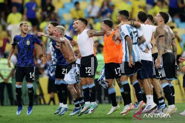 Pemain Argentina Lautaro Martinez berselebrasi bersama rekannya setelah mengalahkan tim Brasil seusai pertandingan sepak bola kualifikasi Piala Dunia 2026 zona Amerika Selatan di Estadio Maracana, Rio de Janeiro, Brasil, Rabu (22/11/2023). Pertandingan sengit itu berakhir kemenangan bagi Argentina dengan skor 1-0. ANTARA FOTO/Reuters/Sergio Moraes/nym.