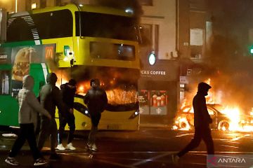 Api berkobar di lokasi kerusuhan yang terjadi akibat penikaman massal terhadap sejumlah anak dan dewasa di sebuah sekolah di Dublin, Irlandia, Kamis (23/11/2023). Penikaman tersebut melukai tiga anak dan dua orang dewasa dan menyulut kerusuhan di wilayah tersebut. ANTARA FOTO/REUTERS/Clodagh Kilcoyne/foc.