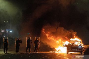 Polisi anti huru hara berjaga dekat mobil terbakar di lokasi kerusuhan yang terjadi akibat penikaman massal terhadap sejumlah anak dan dewasa di sebuah sekolah di Dublin, Irlandia, Kamis (23/11/2023). Penikaman tersebut melukai tiga anak dan dua orang dewasa dan menyulut kerusuhan di wilayah tersebut. ANTARA FOTO/REUTERS/Clodagh Kilcoyne/foc.