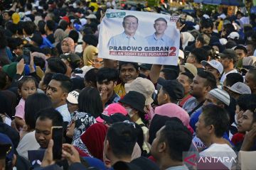 Simpatisan membentangkan poster bergambar pasangan calon Presiden dan calon Wakil Presiden nomor urut 2 Prabowo Subianto-Gibran Rakabuming Raka saat Jalan Sehat Satu Putaran di Jalan Jenderal Sudirman, Makassar, Sulawesi Selatan, Sabtu (25/11/2023). Kegiatan ini dihadiri oleh simpatisan dan kader partai dari Koalisi Indonesia Maju (KIM) sebagai bentuk dukungan terhadap pasangan calon Presiden dan Calon Wakil Presiden, Prabowo Subianto-Gibran Rakabuming Raka pada Pilpres 2024. ANTARA FOTO/Hasrul Said/nym.