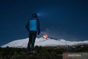 Seorang pria menyaksikan lava pijar dan gumpalan asap keluar dari puncak Gunung Etna yaitu gunung berapi paling aktif di Eropa saat terlihat dari Monte San Leo, Italia, Jumat (24/11/2023). ANTARA FOTO/Etna Walk/Marco Restivo/Handout via Reuters/nym.
