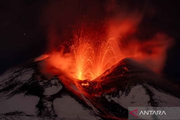 Lava pijar dan gumpalan asap keluar dari puncak Gunung Etna yaitu gunung berapi paling aktif di Eropa saat terlihat dari Monte San Leo, Italia, Jumat (24/11/2023). ANTARA FOTO/Etna Walk/Giuseppe Di Stefano/Handout via Reuters/nym.