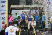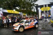 ereli Rifat Sungkar bersama navigator Benjamin Searcy menyapa penonton usai penutupan APRC 2023 di Parapat, Simalungun, Sumatera Utara, Minggu (26/11/2023). Pereli Rifat Sungkar dan Benjamin Searcy berhasil menjadi juara pertama Grand Final Danau Toba Asia Pasific Rally Championship (APRC) 2023, disusul H. Rahmat - Hade Mboi menempati posisi kedua, dan H. Atuy Faturrahman - Emay Achmad pada urutan ketiga. ANTARA FOTO/Fransisco Carolio/aww.