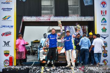 Pereli Rifat Sungkar (kanan) dengan navigator Benjamin Searcy (kiri) melakukan selebrasi saat penutupan APRC 2023 di Parapat, Simalungun, Sumatera Utara, Minggu (26/11/2023). Pereli Rifat Sungkar dan Benjamin Searcy berhasil menjadi juara pertama Grand Final Danau Toba Asia Pasific Rally Championship (APRC) 2023, disusul H. Rahmat - Hade Mboi menempati posisi kedua, dan H. Atuy Faturrahman - Emay Achmad pada urutan ketiga. ANTARA FOTO/Fransisco Carolio/aww.
