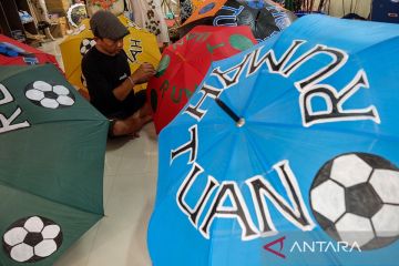 Perajin kain lukis Nasrafa menyelesaikan pembuatan payung lukis bermotif bola di Sentra IKM (Industri Kecil Menengah) Semanggi Harmoni Solo, Jawa Tengah, Senin (27/11/2023). Produk payung lukis dan topi lukis tersebut dijual untuk suvenir menyambut laga semifinal dan final FIFA U-17 World Cup 2023 di Stadion Manahan Solo. ANTARAFOTO/Maulana Surya/Spt.