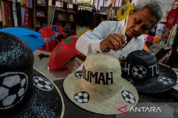 Perajin kain lukis Nasrafa menyelesaikan pembuatan topi lukis bermotif bola di Sentra IKM (Industri Kecil Menengah) Semanggi Harmoni Solo, Jawa Tengah, Senin (27/11/2023). Produk payung lukis dan topi lukis tersebut dijual untuk suvenir menyambut laga semifinal dan final FIFA U-17 World Cup 2023 di Stadion Manahan Solo. ANTARAFOTO/Maulana Surya/Spt.