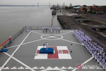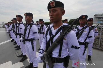 Sejumlah personel TNI Angkatan Laut mengikuti upacara tabur bunga di atas KRI dr. Soeharso-990 di Koarmada II, Surabaya, Jawa Timur, Jumat (1/12/2023). Kegiatan dalam rangka memperingati Hari Armada tersebut bertemakan Armada RI Membangun Kekuatan Laut Nusantara Menuju Indonesia Maju. ANTARA FOTO/Didik Suhartono/YU