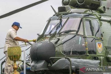 Menteri Pertahanan Prabowo Subianto melakukan penyiraman ke hidung helikopter angkut berat Airbus H225M saat serah terima helikopter angkut berat Airbus H225M di Lanud Atang Sendjaja, Kemang, Bogor, Jumat (1/12/2023). Prabowo Subianto menyerahkan delapan unit helikopter angkut berat Airbus H225M yang dirakit oleh PT Dirgantara Indonesia (DI) serta meresmikan full flight simulator Airbus Helicopters H225M kepada TNI AU Skadron Udara 8 Wing 4 Lanud Atang Sendjaja. ANTARA FOTO/Galih Pradipta/YU