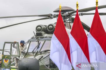 Menteri Pertahanan Prabowo Subianto melakukan pengecekan helikopter saat acara serah terima helikopter angkut berat Airbus H225M di Lanud Atang Sendjaja, Kemang, Bogor, Jumat (1/12/2023). Prabowo Subianto menyerahkan delapan unit helikopter angkut berat Airbus H225M yang dirakit oleh PT Dirgantara Indonesia (DI) serta meresmikan full flight simulator Airbus Helicopters H225M kepada TNI AU Skadron Udara 8 Wing 4 Lanud Atang Sendjaja. ANTARA FOTO/Galih Pradipta/YU